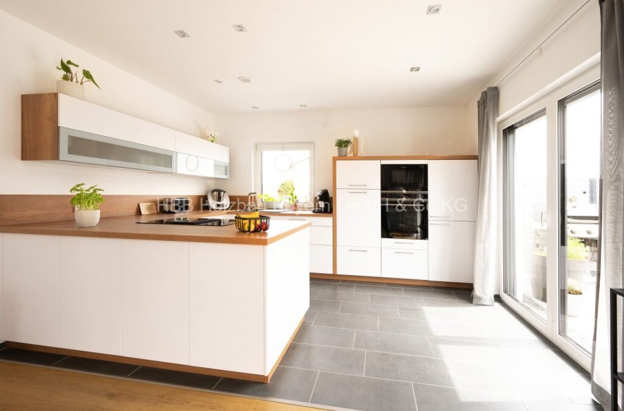 Das Badezimmer ist mit einem Fenster ausgestattet, das nicht nur für frische Luft sorgt, sondern auch das Tageslicht hereinlässt – eine besonders praktische und angenehme Eigenschaft, die das morgendliche Ritual noch schöner macht. Zusätzlich steht ein separates Gäste-WC zur Verfügung, das den Komfort für Bewohner und Besucher gleichermaßen erhöht. Die offene Küche verbindet Funktionalität mit modernem Wohnstil und schafft einen einladenden Treffpunkt für gemeinsame Mahlzeiten und geselliges Beisammensein.